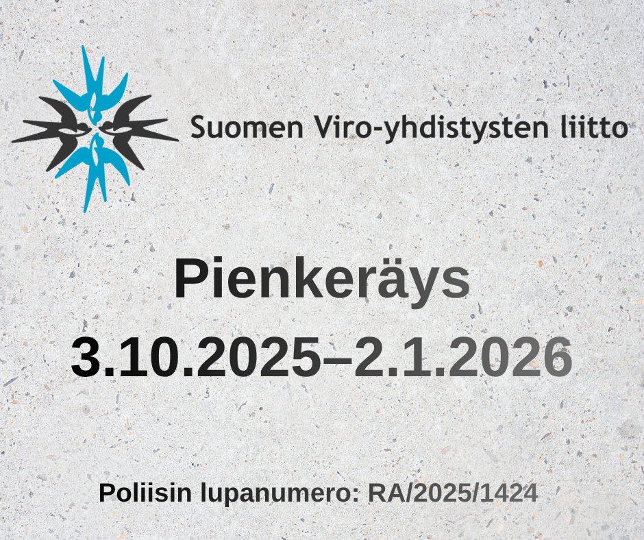 Suomen Viro-yhdistysten liitto (SVYL) käynnisti lokakuussa pienkeräyksen (poliisin lupanumero: RA/2025/1424) ajalle 3.10.2025–2.1.2026.